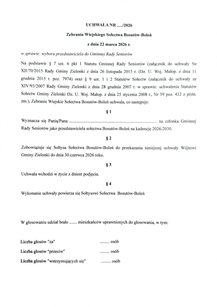 Na zebraniu będziemy podejmować Uchwałę w sprawie wyboru członka Rady Gminnej Seniorów.